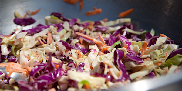 There are so many ways to screw up Cole Slaw. I like a basic recipe. It’s supposed to be about the vegetables, so I don’t goop it up with too much of anything else. Finding the correct balance between sweet and tart is the key. I start with equal parts red and green cabbage, sliced thin. Add to that grated carrot, salt, apple cider vinegar, mayonnaise and honey. Start with a little of each. Keep tasting and adding more until your preferred balance is achieved.