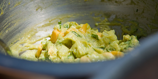 Standard guacamole doesn’t need much gussying up, but I was in a festive mood with the great weather, so I went tropical. The base recipe is mashed avocado, minced white onion, minced jalapeno, salt and lime juice. Then I added cilantro and diced mango.