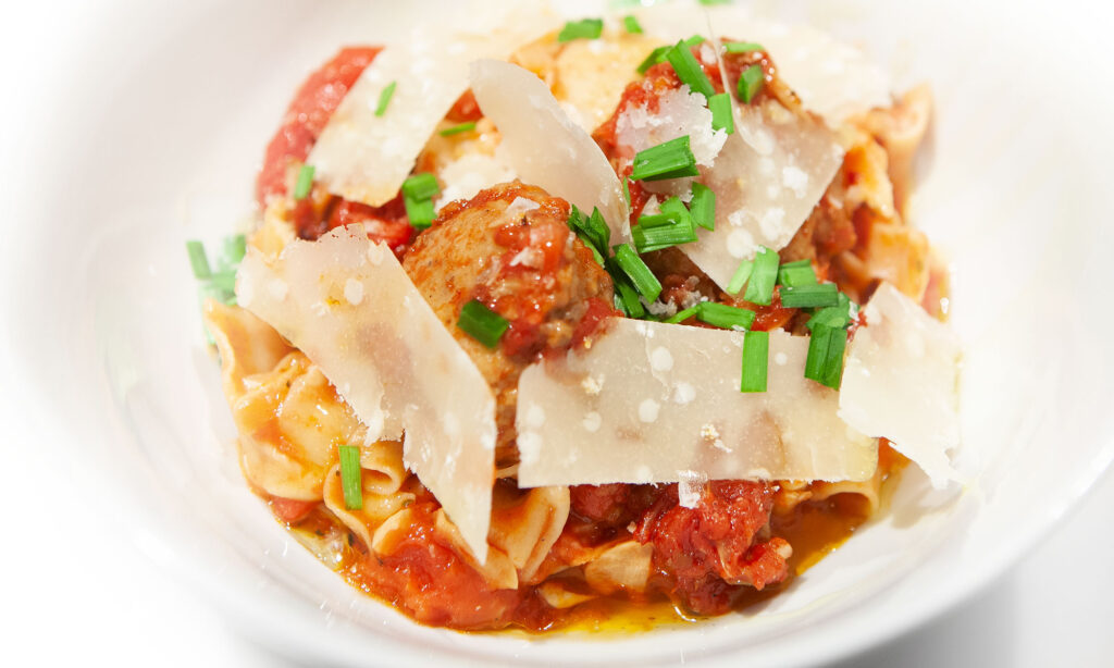Tagliatelle Meatballs and Gravy Posted byChristian Bowers 02/25/2021 House made egg pasta Tagliatelle, beef pork ricotta meatballs, slow simmered San Marzano tomatoes, Parmigiano Reggiano, garlic chives, lemon, finishing salt, olive oil.