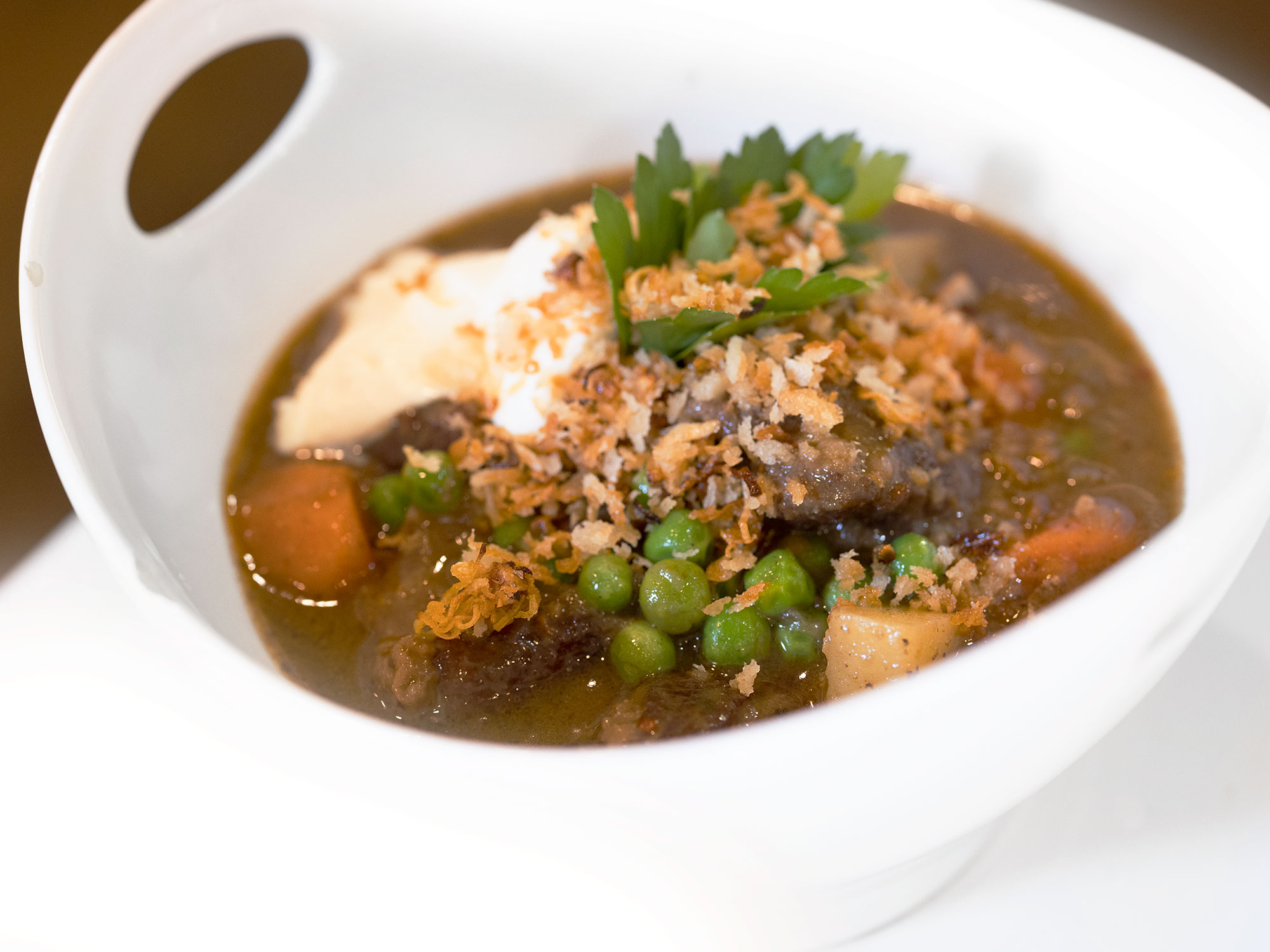 Mushroom stock, chicken stock, veg stock, red wine, beer. Beef, carrot, peas. Two different potatoes: fingerlings and russet. The contrast was for the win. Creme Fraiche and Fried Shallot Panko topping.